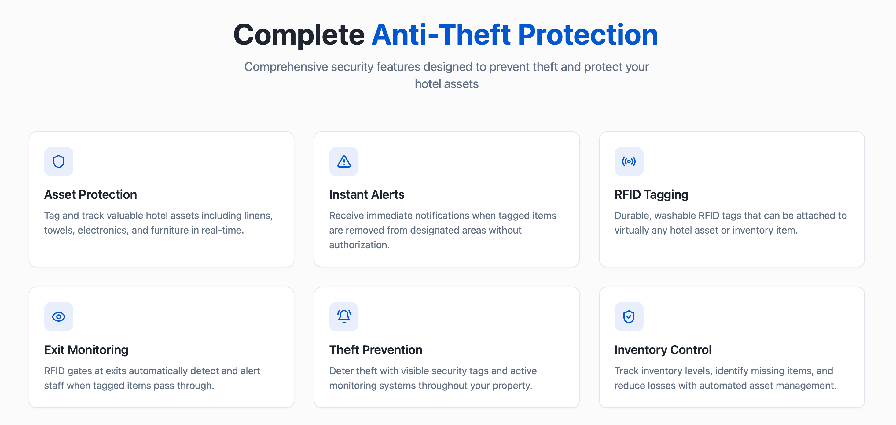 Join hundreds of hotels worldwide reducing theft by up to 80% with our RFID anti-theft systems. Schedule your free security assessment today.